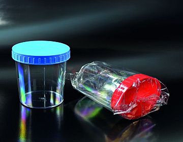 Lọ đựng mẫu nhựa PS Aptaca 150ml tiệt trùng có nhãn - Hộp đựng nước tiểu có vạch chia đến 125 ml, kèm nắp vặn. Chất liệu: Polystyrene (PS). Xuất xứ: Ý